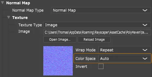 - Auto (default): Automatically detects the color space based on file format. Rayscaper assumes sRGB for low-dynamic range formats and linear for high-dynamic range formats. Normal maps are always treated as linear regardless of format.